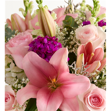 A dazzling gathering of pink and purple, this bouquet will delight all the marvelous moms in your life. Our florists artistically arrange farm-fresh roses, Asiatic lilies, and other blooms to create a gift that expresses your love and appreciation in a way words never could.